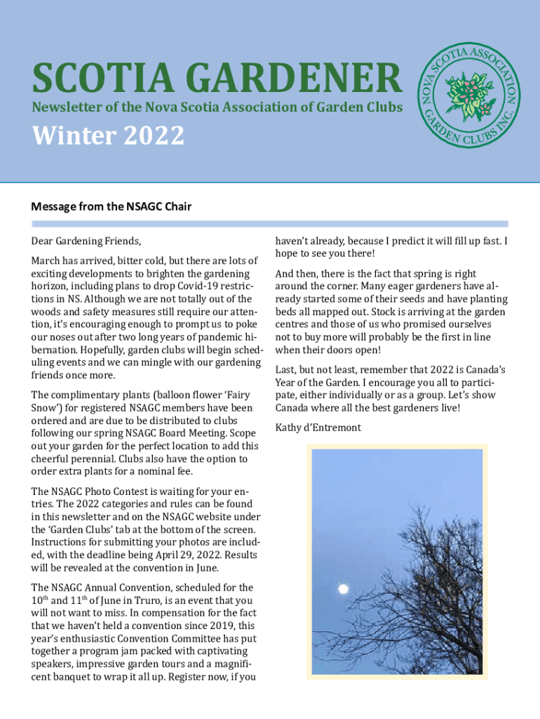SCOTIA GARDENERNewsletter of the Nova Scotia Association of Garden ClubsWinter 2022Message from the NS AGC Chair Dear Gardening Friends, March has arrived, bitter cold, but there are lots of exciting