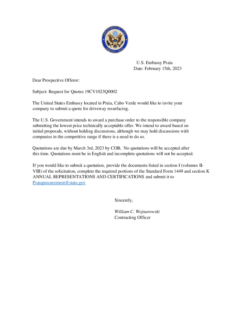 U.S. Embassy Praia Date: February 15th, 2023 Dear Prospective Offer or: Subject: Request for Quotes 19CV1023Q0002 The United States Embassy located in Praia, Cab Verde would like to invite your company