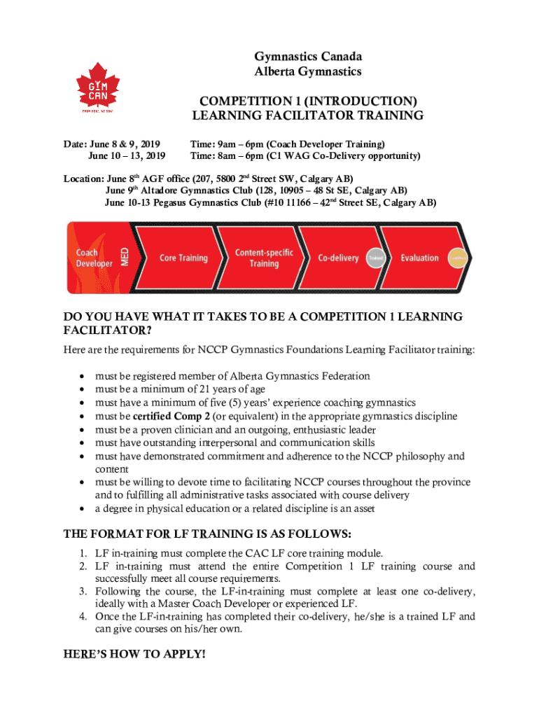 Gymnastics Canada Alberta Gymnastics COMPETITION 1 (INTRODUCTION) LEARNING FACILITATOR TRAINING Date: June 8 & 9, 2019 June 10 13, 2019Time: 9am 6pm (Coach Developer Training) Time: 8am 6pm (C1 WAG