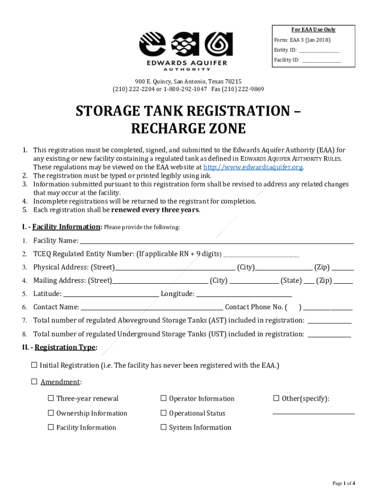 For EAA Use Only Form: EAA 3 (Jan 2018) Entity ID: ___ Facility ID: ___900 E. Quincy, San Antonio, Texas 78215 (210) 2222204 or 18002921047 Fax (210) 2229869STORAGE TANK REGISTRATION RECHARGE ZONE