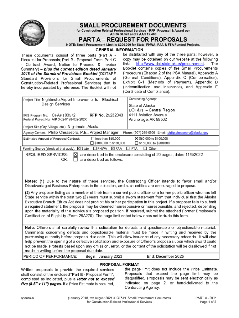 SMALL PROCUREMENT DOCUMENTS for Construction Related Professional Services RFP, Proposal & Award per AS 36.30.320 and 2 AAC 12.400PART A REQUEST FOR PROPOSALS NOTE: Small Procurement Limit is $200,000