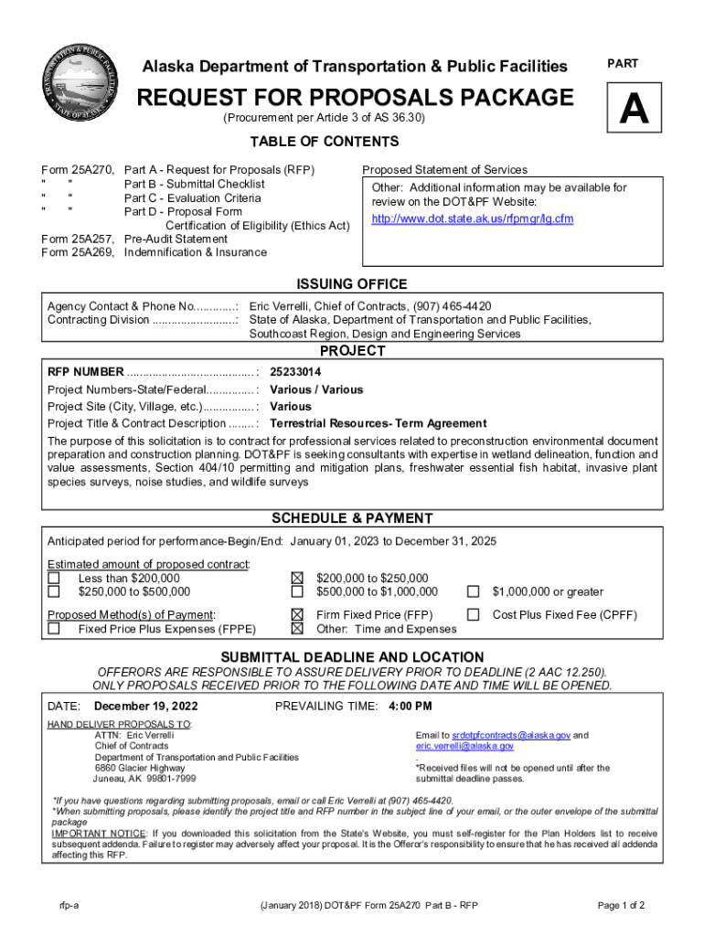 Alaska Department of Transportation & Public FacilitiesPARTAREQUEST FOR PROPOSALS PACKAGE (Procurement per Article 3 of AS 36.30)TABLE OF CONTENTS Form 25A270, \” \” \” \” \” \” Part A