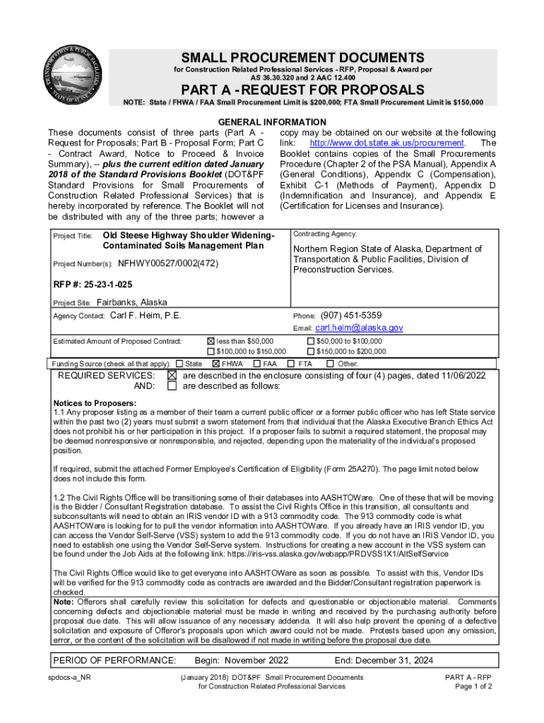 SMALL PROCUREMENT DOCUMENTS for Construction Related Professional Services RFP, Proposal & Award per AS 36.30.320 and 2 AAC 12.400PART A REQUEST FOR PROPOSALS NOTE: State / FHA / FAA Small Procurement