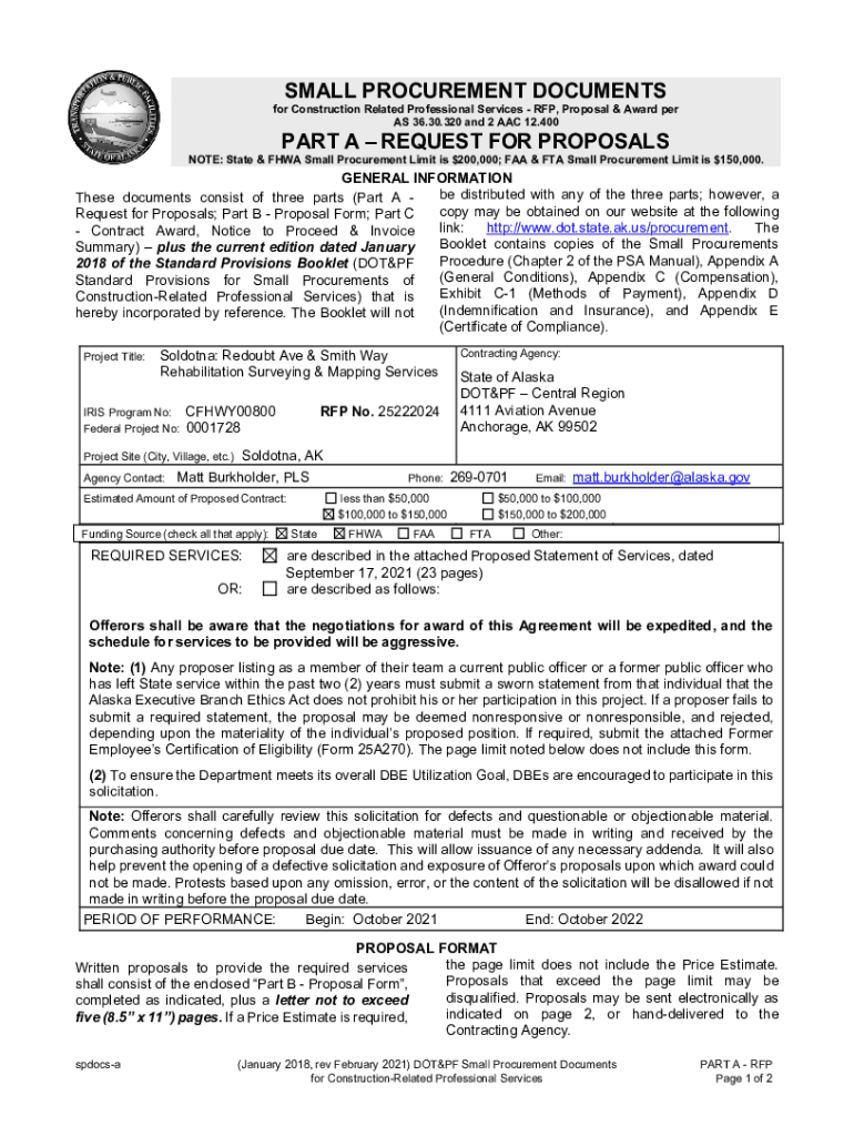 SMALL PROCUREMENT DOCUMENTS for Construction Related Professional Services RFP, Proposal & Award per AS 36.30.320 and 2 AAC 12.400PART A REQUEST FOR PROPOSALSNOTE: State & FHA Small Procurement Limit