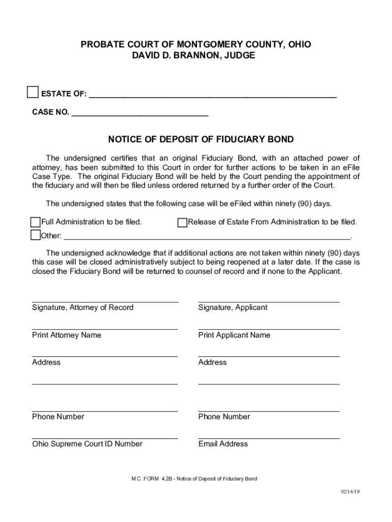 PROBATE COURT OF MONTGOMERY COUNTY, OHIO DAVID D. BRANNON, JUDGEESTATE OF: ___ CASE NO. ___NOTICE OF DEPOSIT OF FIDUCIARY BOND The undersigned certifies that an original Fiduciary Bond, with an attached