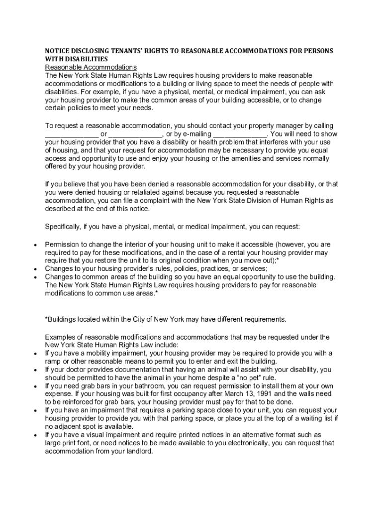 NOTICE DISCLOSING TENANTS\' RIGHTS TO REASONABLE ACCOMMODATIONS FOR PERSONS WITH DISABILITIES Reasonable Accommodations The New York State Human Rights Law requires housing providers to make reasonable