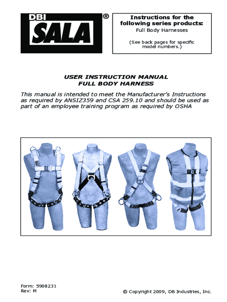 Instructions for the following series products: Full Body Harnesses (See back pages for specie model numbers.) User Instruction Manual Full Body Harness This manual is intended to meet the Manufacturers