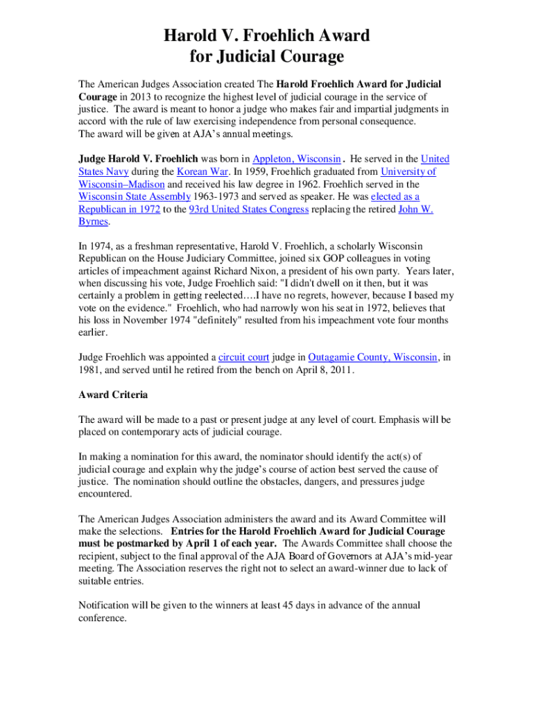 Harold V. Frolic Award for Judicial Courage The American Judges Association created The Harold Frolic Award for Judicial Courage in 2013 to recognize the highest level of judicial courage in the service
