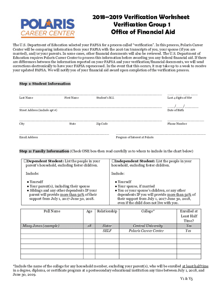 20182019 Verification Worksheet Verification Group 1 Office of Financial Aid The U.S. Department of Education selected your FAFSA for a process called verification. In this process, Polaris Career