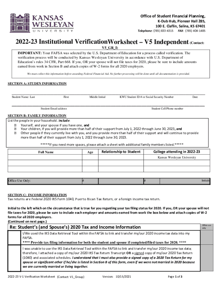 Office of Student Financial Planning, Dub Hub, Pioneer Hall 285, 100 E. Chaplin, Salina, KS 67401Telephone: (785) 8334315FAX: (785) 4041485202223 Institutional VerificationWorksheet V5 Independent