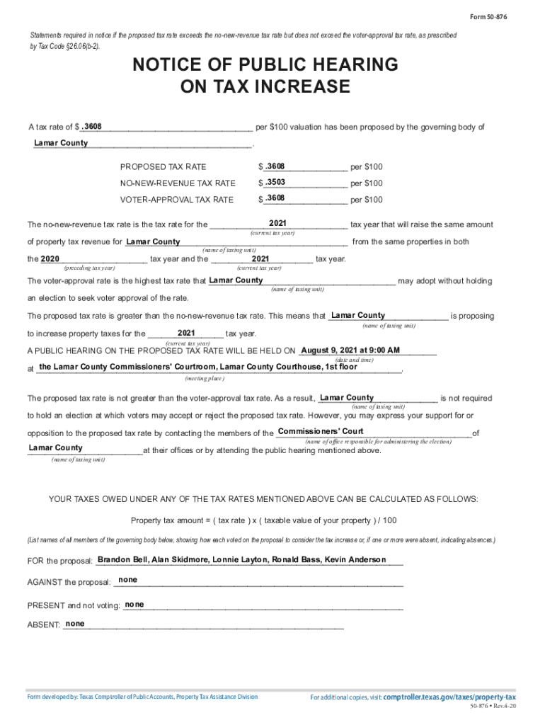 Form 50876Statements required in notice if the proposed tax rate exceeds the nonewrevenue tax rate but does not exceed the voter approval tax rate, as prescribed by Tax Code 26.06(b2).NOTICE OF PUBLIC