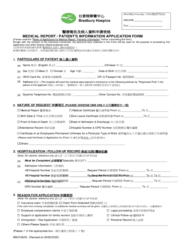 Bradbury Hospice(For Office Use only) MRO/MR Date: MEDICAL REPORT / PATIENT\'S INFORMATION APPLICATION FORM (Please read the Notes of Application for Medical Report / Patient\'s Information before