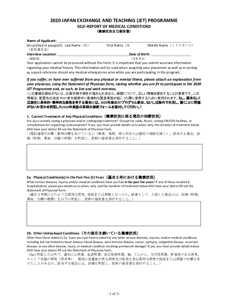 2020 JAPAN EXCHANGE AND TEACHING (JET) Program TELEPORT OF MEDICAL CONDITIONS Name of Applicant: ___ (As printed in passport) Last Name First Name Middle Name Interview Location: ___Date of Birth: