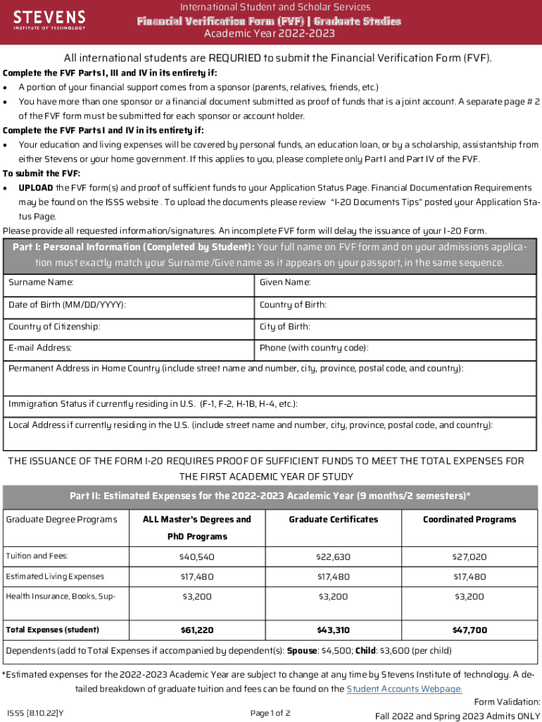 International Student and Scholar ServicesFinancial Verification Form (FVF) | Graduate Studies Academic Year 20222023All international students are REBURIED to submit the Financial Verification Form
