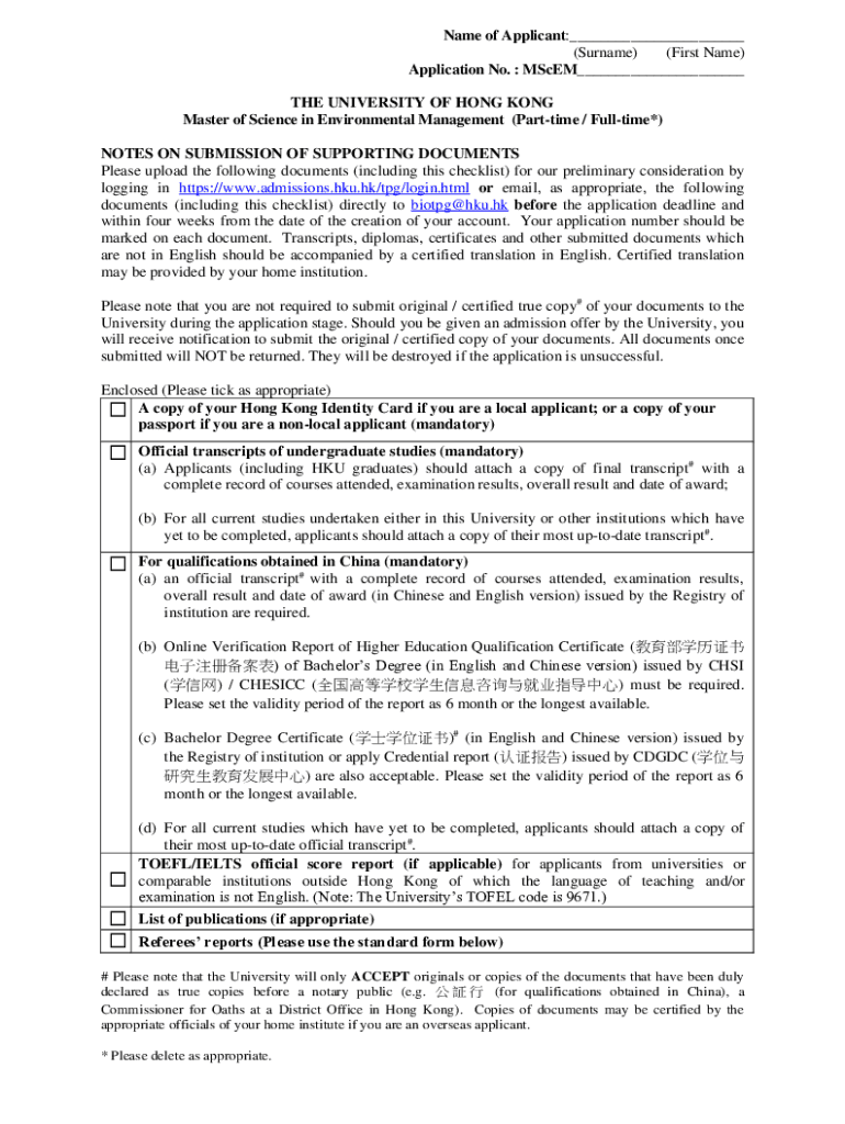 Name of Applicant:___ (Surname) (First Name) Application No. ESCEM___ THE UNIVERSITY OF HONG KONG Master of Science in Environmental Management (Part time / Full time*) NOTES ON SUBMISSION OF SUPPORTING