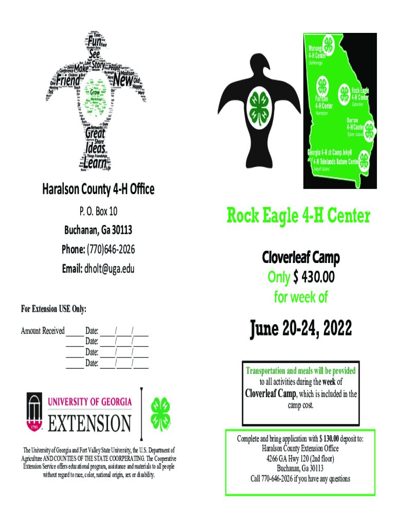 Harrison County 4H Office P. O. Box 10 Buchanan, Ga 30113 Phone: (770)6462026 Email: dholt@uga.edu For Extension USE Only: Amount Received ___ Date: ___/___/___ ___ Date: ___/___/___ ___ Date: ___/___/___