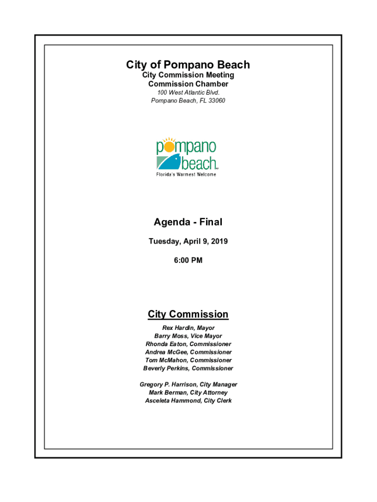 City of Pompano Beach City Commission Meeting Commission Chamber 100 West Atlantic Blvd. Pompano Beach, FL 33060Agenda Final Tuesday, April 9, 2019 6:00 City Commission Rex Hardin, Mayor Barry Moss,