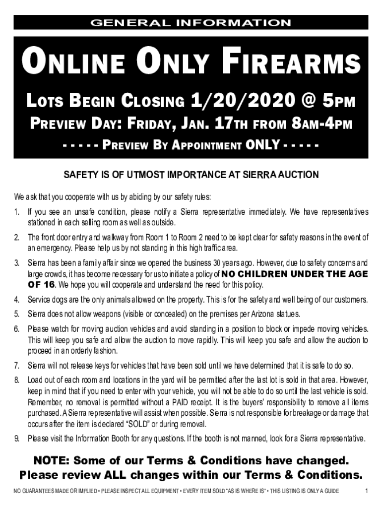 GENERAL INFORMATIONOnline Only Firearms Lots Begin Closing 1/20/2020 @ 5pm Preview Day: Friday, Jan. 17thfrom8am4pm Preview By Appointment ONLY SAFETY IS OF UTMOST IMPORTANCE AT SIERRA AUCTION We