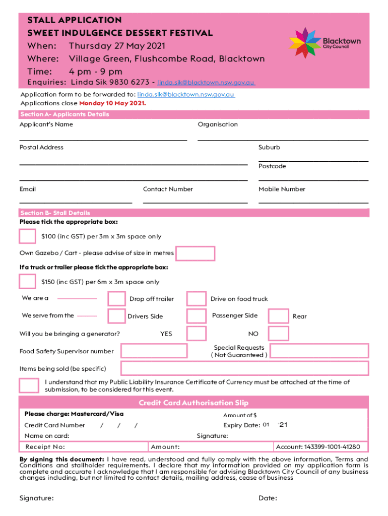 STALL APPLICATION SWEET INDULGENCE DESSERT FESTIVAL When:Thursday 27 May 2021 Where:Village Green, Flashcube Road, Blacktown 4 pm 9 pm Time:Inquiries: Linda Six 9830 6273 linda.sik@blacktown.nsw.gov.au