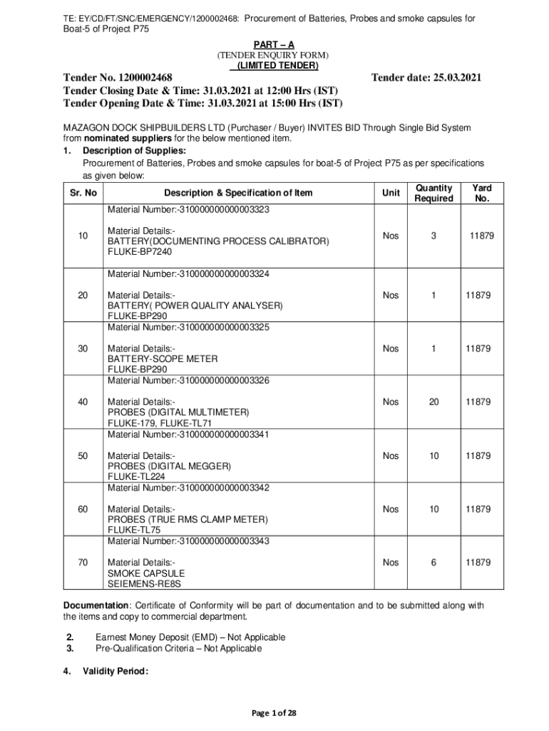 TE: EY/CD/FT/SNC/EMERGENCY/1200002468: Procurement of Batteries, Probes and smoke capsules forBoat5 of Project P75 PART A (TENDER Inquiry FORM) (LIMITED TENDER)Tender No. 1200002468 Tender Closing