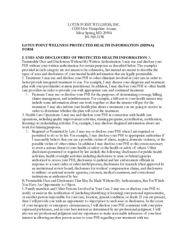 LOTUS POINT WELLNESS, INC. 13200 New Hampshire Avenue Silver Spring, MD 20904 3019601198 LOTUS POINT WELLNESS PROTECTED HEALTH INFORMATION (HIPAA) FORM. USES AND DISCLOSURES OF PROTECTED HEALTH INFORMATION