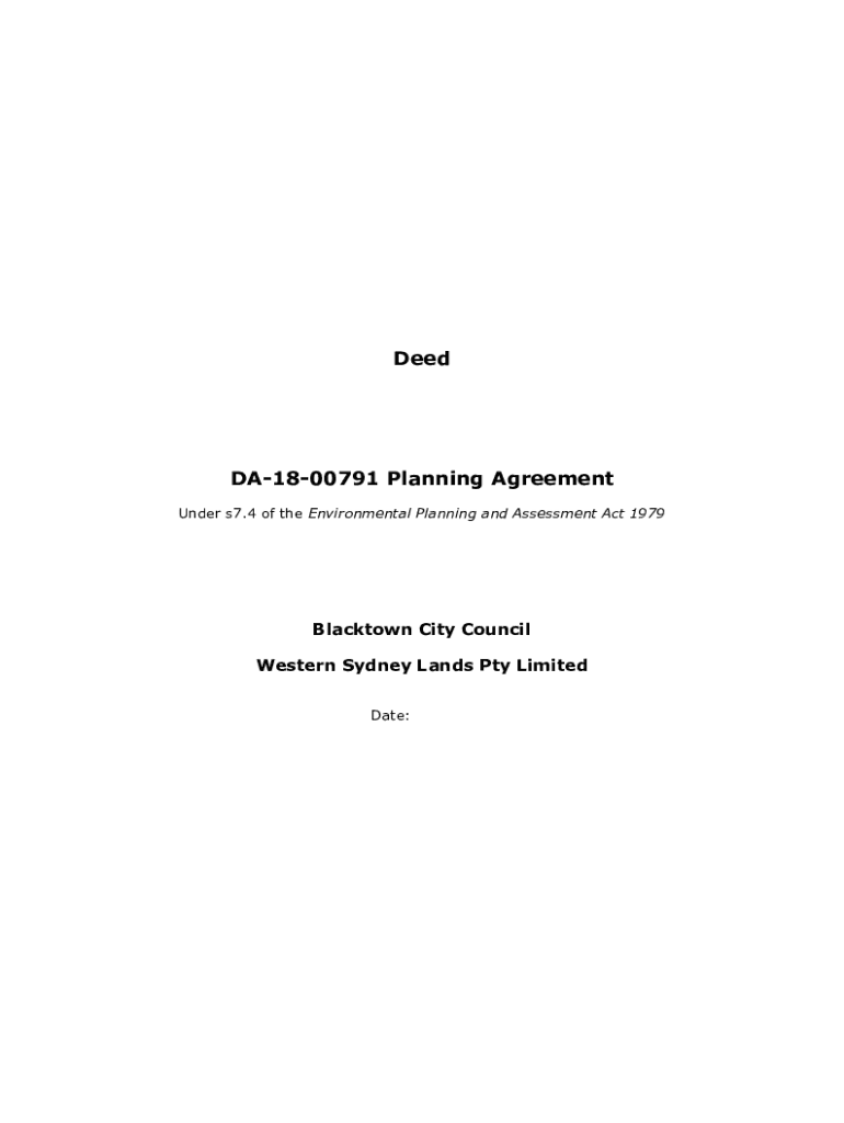 DeedDA1800791 Planning Agreement Under s7.4 of the Environmental Planning and Assessment Act 1979Blacktown City Council Western Sydney Lands Pty Limited Date:DA1800791 Planning Agreement Blacktown