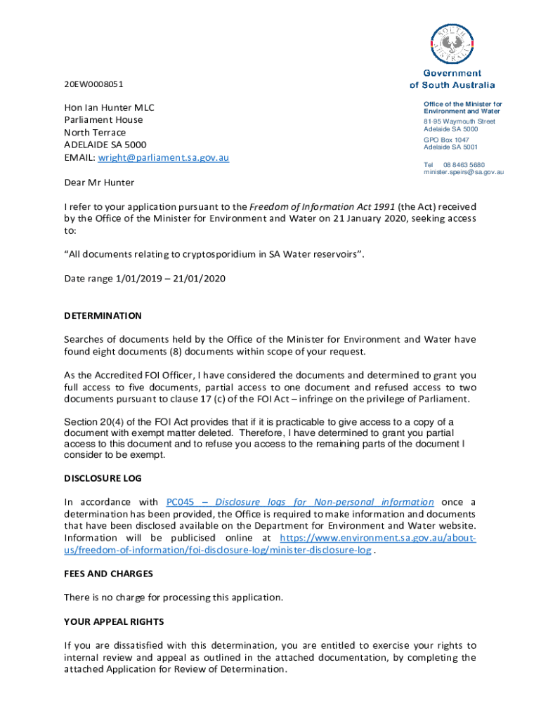 20EW0008051Hon Ian Hunter MLC Parliament House North Terrace ADELAIDE SA 5000 EMAIL: wright@parliament.sa.gov.au Dear Mr Interoffice of the Minister for Environment and Water 8195 Way mouth Street