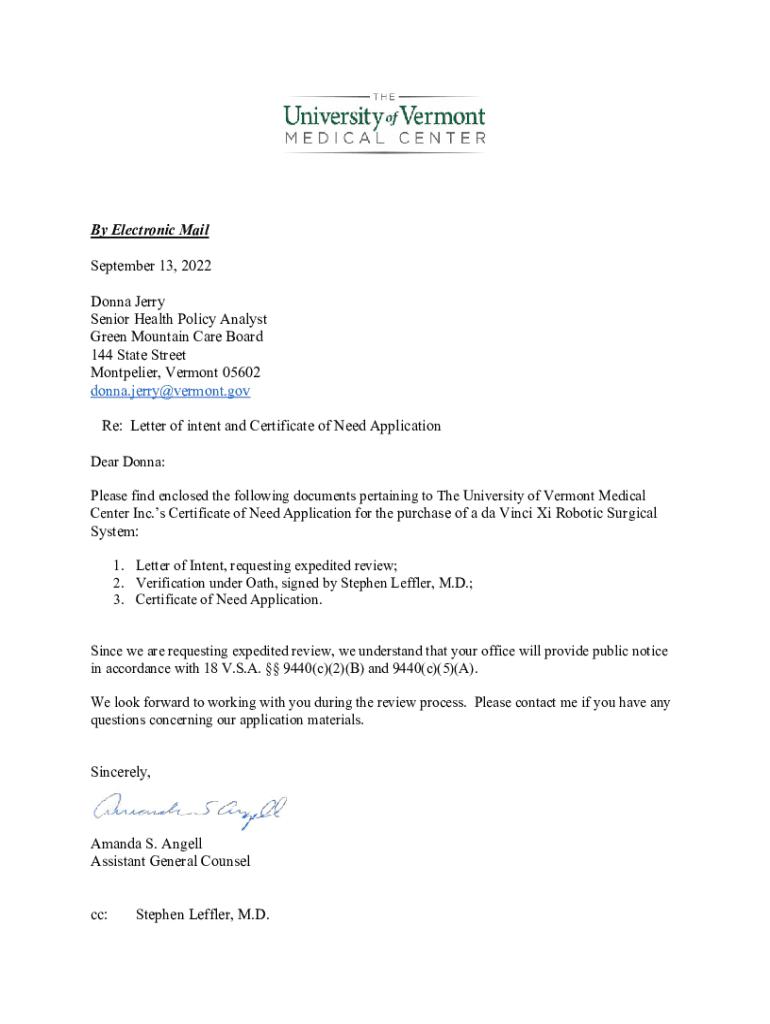 By Electronic Mail September 13, 2022, Donna Jerry Senior Health Policy Analyst Green Mountain Care Board 144 State Street Montpelier, Vermont 05602 donna.jerry@vermont.gov Re: Letter of intent and