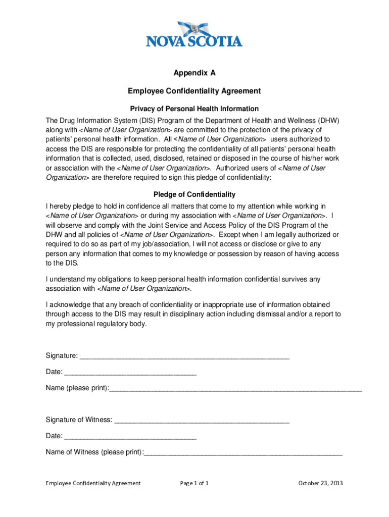Appendix A Employee Confidentiality Agreement Privacy of Personal Health Information The Drug Information System (DIS) Program of the Department of Health and Wellness (DOW) along with Name of User