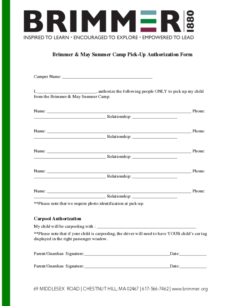 Brimmed & May Summer Camp Pickup Authorization Forecaster Name: ___ I, ___, authorize the following people ONLY to pick up my child from the Brimmed & May Summer Camp. Name: ___ Phone: ___ Relationship: