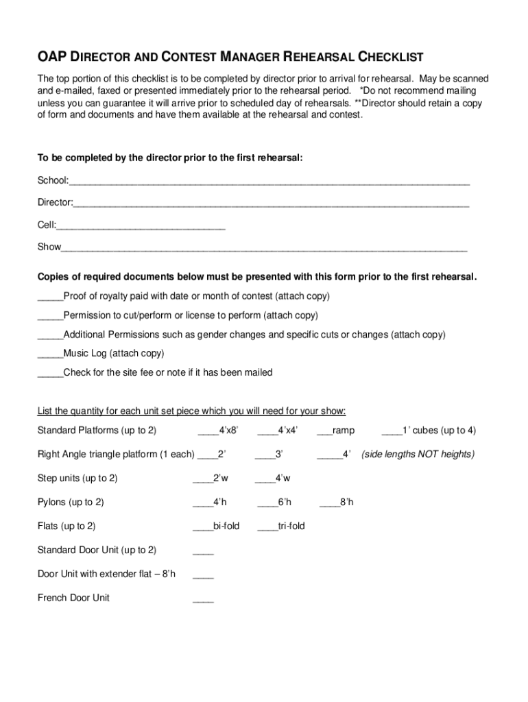 OAP DIRECTOR AND CONTEST MANAGER REHEARSAL CHECKLIST The top portion of this checklist is to be completed by director prior to arrival for rehearsal. May be scanned and emailed, faxed or presented