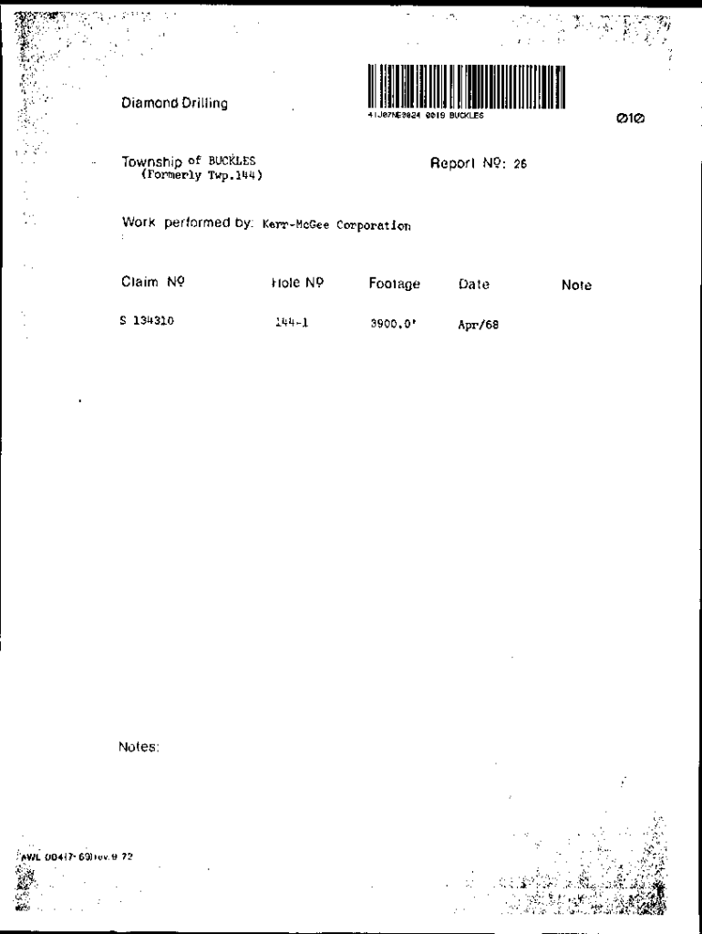R×I\'v., UV. : \'f. ,.e,.\' t1/\'*\' n, 1 Diamond Drilling s BUCKLESTownship of BUCKLES010Report N9: 26(Formerly Twp.144)Work performed by: KerrHcGee CorporationClaim Whole N9FootageDateS 134310WUl3900.0\'Apr/68Notes:\'