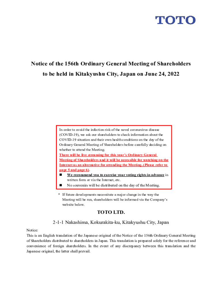 Notice of the 156th Ordinary General Meeting of Shareholders to be held in Kitakyushu City, Japan on June 24, 2022In order to avoid the infection risk of the novel coronavirus disease (COVID-19),