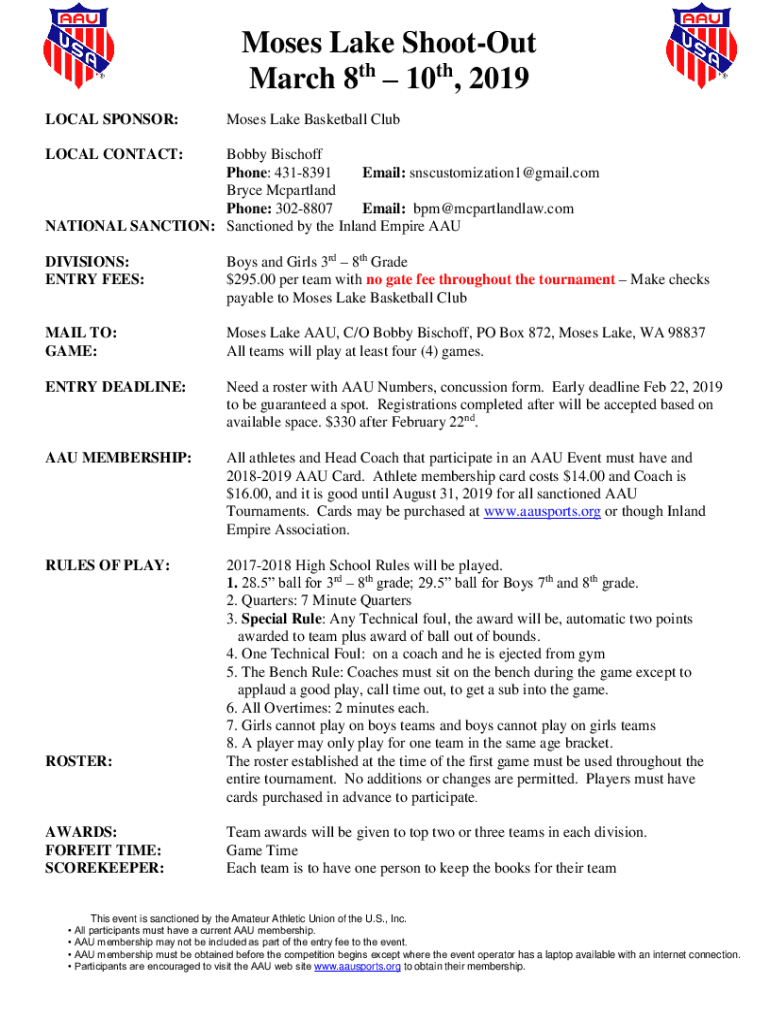 Moses Lake Shootout March 8th 10th, 2019 LOCAL SPONSOR:Moses Lake Basketball Cubical CONTACT:Bobby Bishop Phone: 4318391 Email: snscustomization1@gmail.com Bryce McFarland Phone: 3028807 Email: bpm@mcpartlandlaw.com