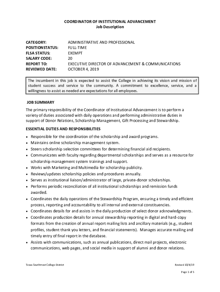 COORDINATOR OF INSTITUTIONAL ADVANCEMENT Job Description CATEGORY: POSITIONSTATUS: FLEA STATUS: SALARY CODE: REPORT TO: REVIEWED DATE:ADMINISTRATIVE AND PROFESSIONAL FULL TIME EXEMPT 20 EXECUTIVE