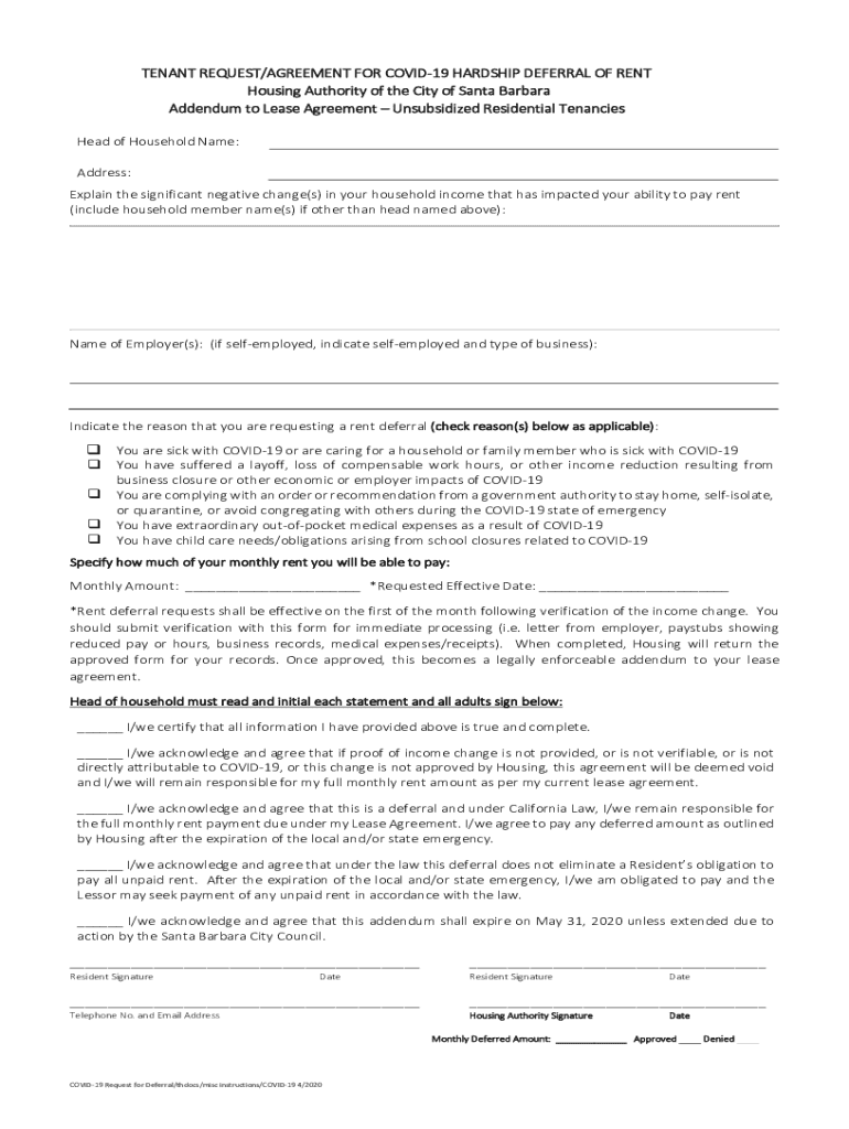 TENANT REQUEST/AGREEMENT FOR COVID-19 HARDSHIP DEFERRAL OF RENT Housing Authority of the City of Santa Barbara Addendum to Lease Agreement Unsubsidized Residential Tenancies Head of Household Name: