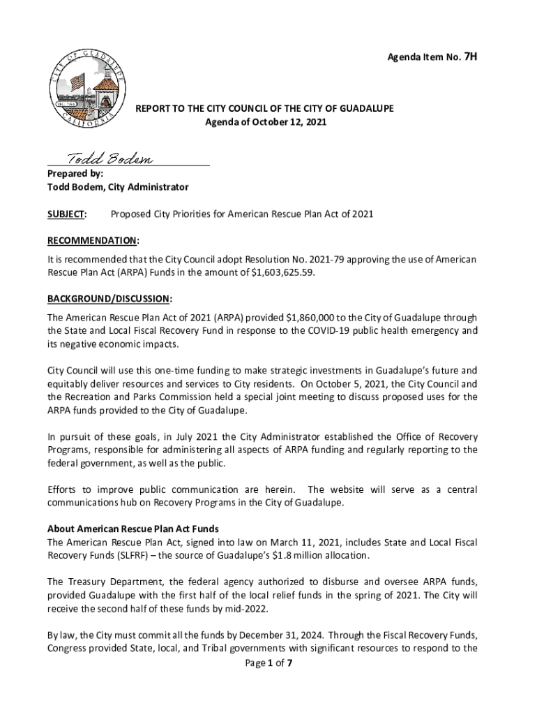 Agenda Item No. 7HREPORT TO THE CITY COUNCIL OF THE CITY OF GUADALUPE Agenda of October 12, 2021 ___ Prepared by: Todd Modem, City Administrator SUBJECT:Proposed City Priorities for American Rescue