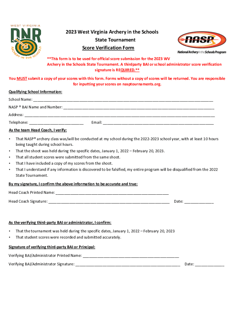 2023 West Virginia Archery in the Schools State Tournament Score Verification Form **This form is to be used for official score submission for the 2023 WV Archery in the Schools State Tournament.