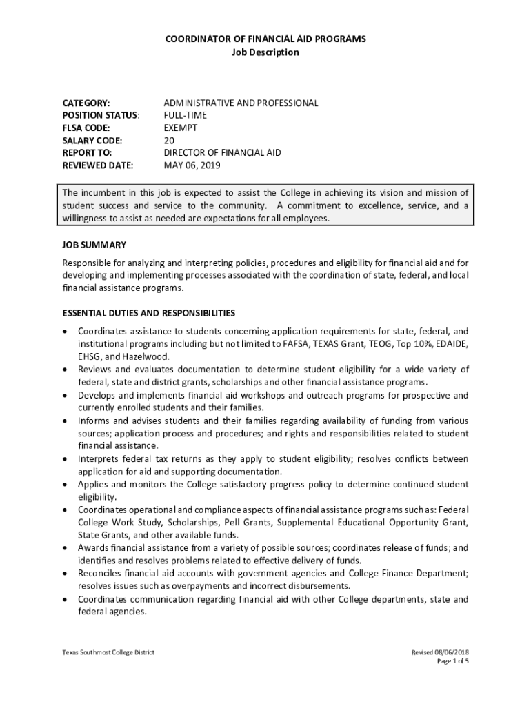 COORDINATOR OF FINANCIAL AID PROGRAMS Job DescriptionCATEGORY: POSITION STATUS: FLEA CODE: SALARY CODE: REPORT TO: REVIEWED DATE:ADMINISTRATIVE AND PROFESSIONAL FULL TIME EXEMPT 20 DIRECTOR OF FINANCIAL