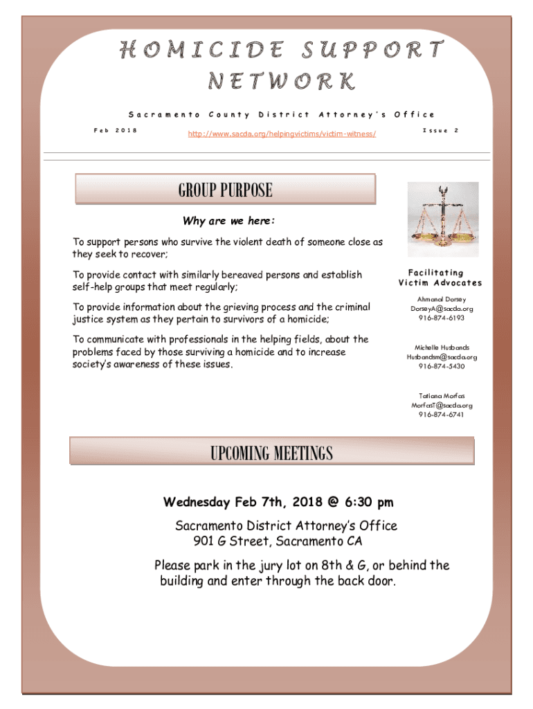 HOMICIDESUPPORTNETWORK S a c r an m e n t o F e b2 0 1 8C o u n t yd i s t r i c ta t o r n e y so f i c HTTP://www.sacda.org/helpingvictims/victimwitness/I s u e2GROUP PURPOSE Why are we here: To