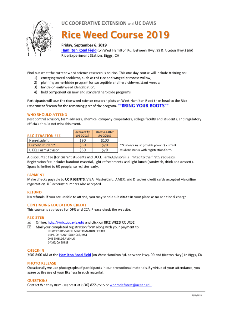 UC COOPERATIVE EXTENSION and UC Divisive Weed Course 2019 Friday, September 6, 2019, Hamilton Road Field (on West Hamilton Rd. between Hwy. 99 & Rice ton Hwy.) and Rice Experiment Station, Biggs,