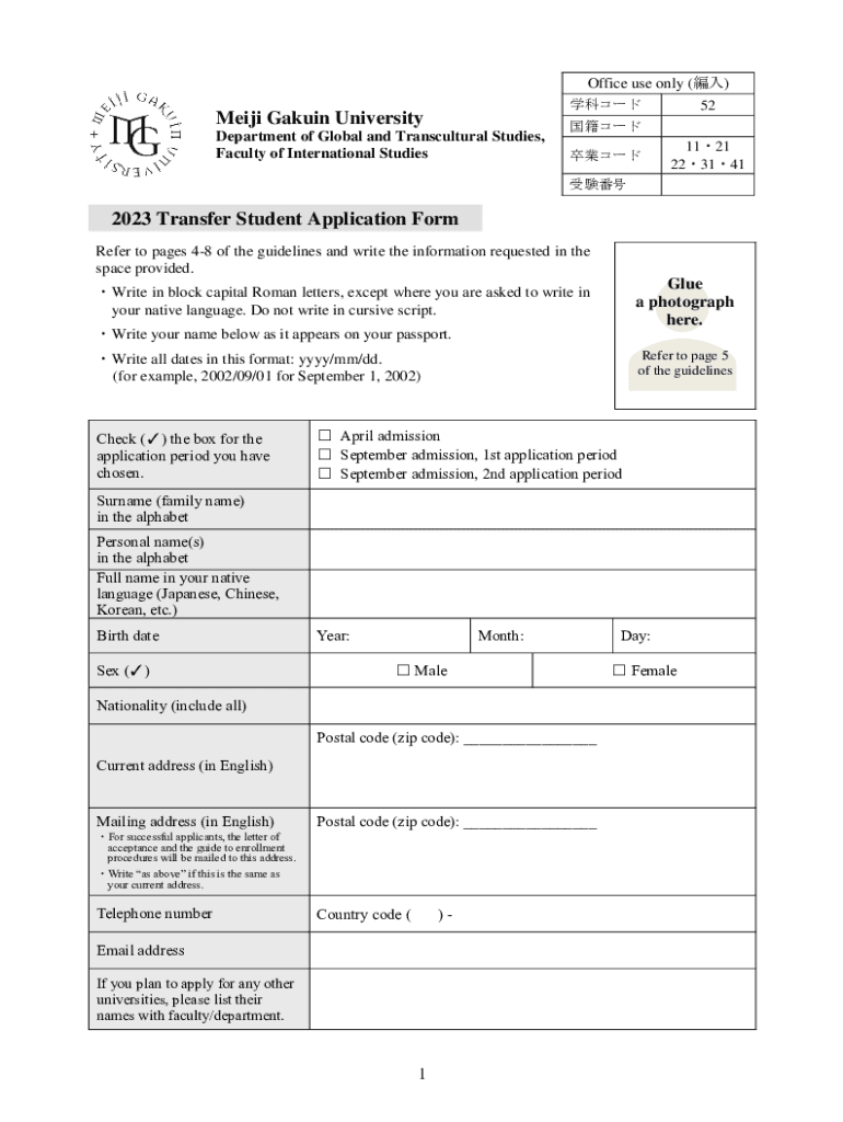 Office uses only () 52Meiji Gain University Department of Global and Transcultural Studies, Faculty of International Studies 1121 2231412023 Transfer Student Application Form Refers to pages 48 of