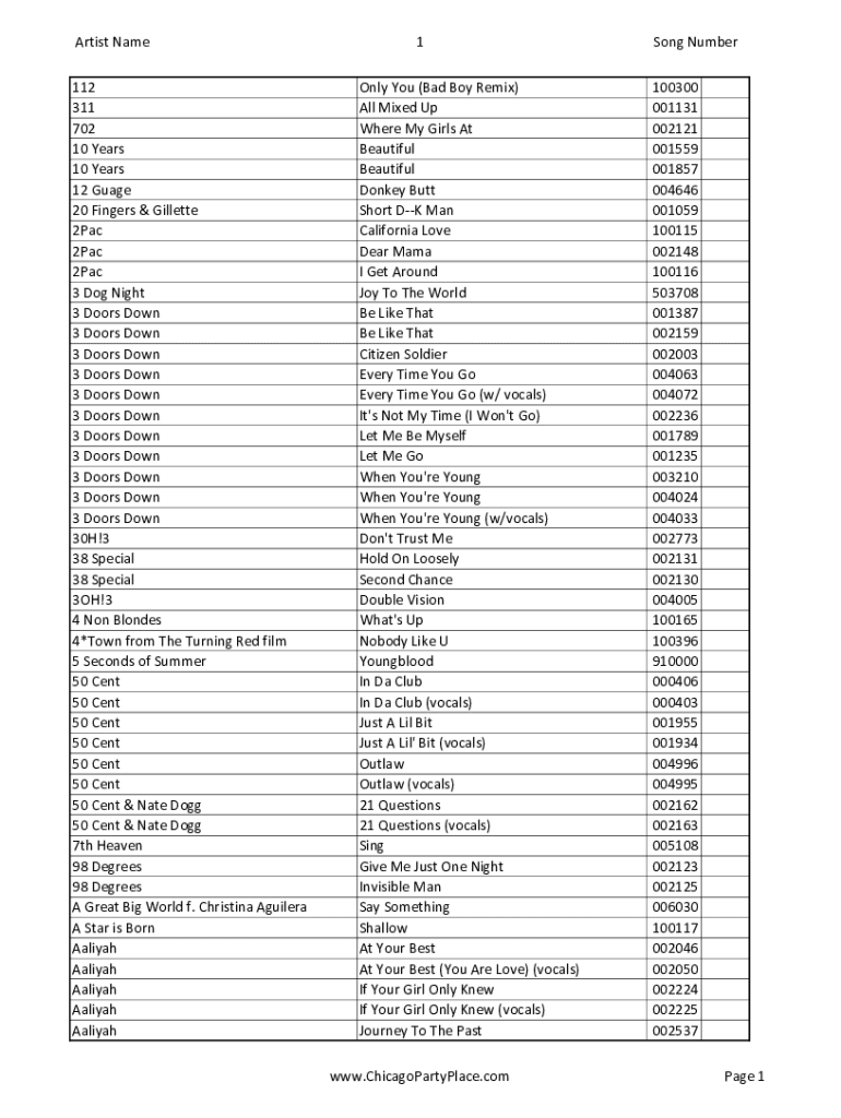 Artist Name 112 311 702 10 Years 10 Years 12 Gauge 20 Fingers & Gillette 2Pac 2Pac 2Pac 3 Dog Night 3 Doors Down 3 Doors Down 3 Doors Down 3 Doors Down 3 Doors Down 3 Doors Down 3 Doors Down 3 Doors