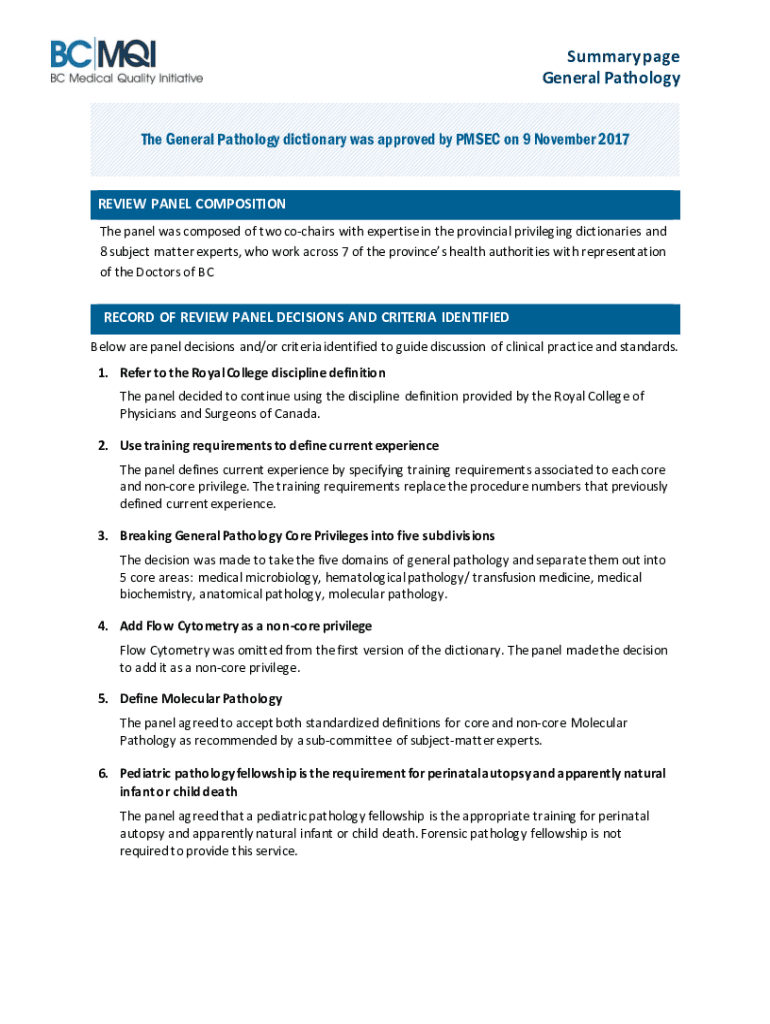 Summary page General Pathology The General Pathology dictionary was approved by PM SEC on 9 November 2017REVIEW PANEL COMPOSITION The panel was composed of two coheres with expertise in the provincial