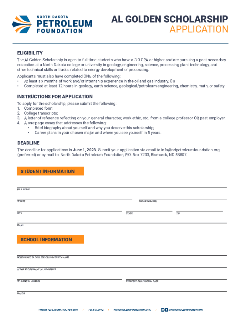 AL GOLDEN SCHOLARSHIP APPLICATION ELIGIBILITY The Al Golden Scholarship is open to full time students who have a 3.0 GPA or higher and are pursuing a postsecondary education at a North Dakota college