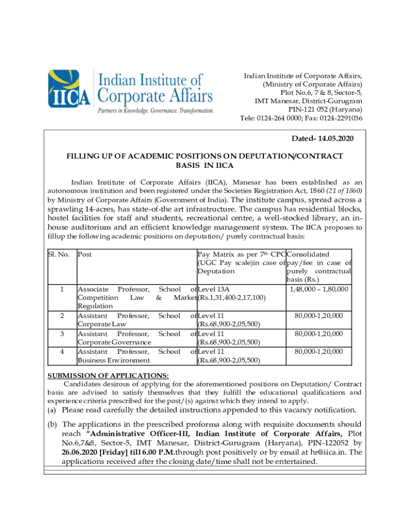 Indian Institute of Corporate Affairs, (Ministry of Corporate Affairs) Plot No.6, 7 & 8, Sector5, IMT Caesar, DistrictGurugram PIN121 052 (Haryana) Tell: 0124264 0000; Fax: 01242291036Dated 14.05.2020