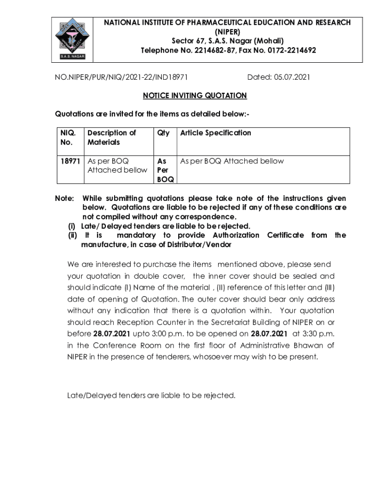 Get the free Quotations are invited for the items as detailed below:NIQ - niper gov