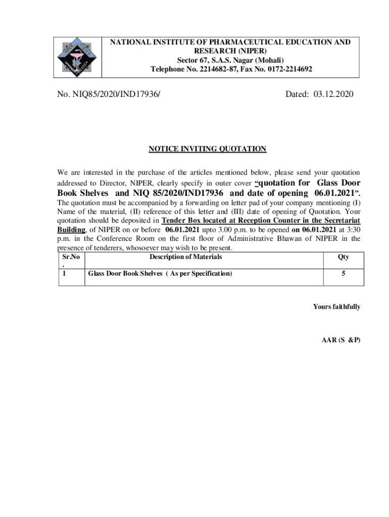 NATIONAL INSTITUTE OF PHARMACEUTICAL EDUCATION AND RESEARCH (SNIPER) Sector 67, S.A.S. Nagar (Moral) Telephone No. 221468287, Fax No. 01722214692No. NIQ85/2020/IND17936/Dated: 03.12.2020NOTICE INVITING