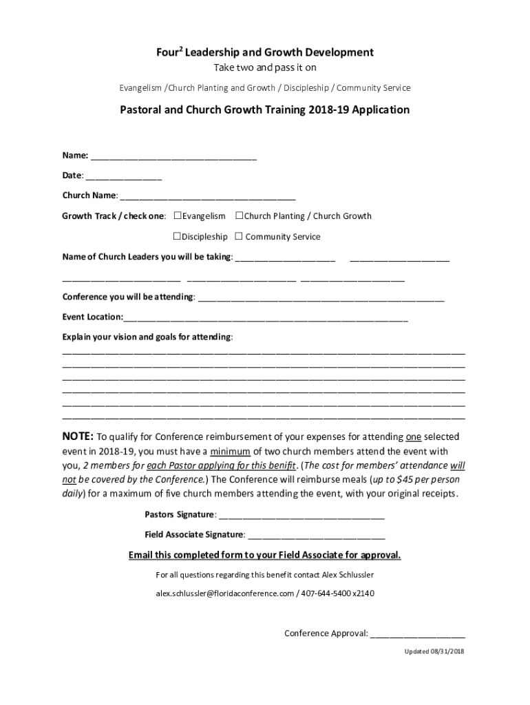 Four2LeadershipandGrowthDevelopment Taketwoandpassiton Evangelism/ChurchPlantingandGrowth/Discipleship/CommunityServicePastoralandChurchGrowthTraining201819Application Name:___ Date:___ Churchgate:___