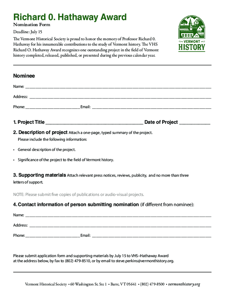 Richard 0. Hathaway Award Nomination Form Deadline: July 15 The Vermont Historical Society is proud to honor the memory of Professor Richard 0. Hathaway for his innumerable contributions to the study
